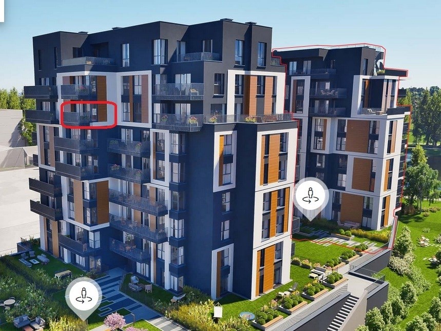Apartament znajduje się na 6 piętrze 8 piętrowego budynku. Wysokość pomieszczeń wynosi 280 cm. W skład mieszkania wchodzi: salon z aneksem kuchennym (20,23 m2),