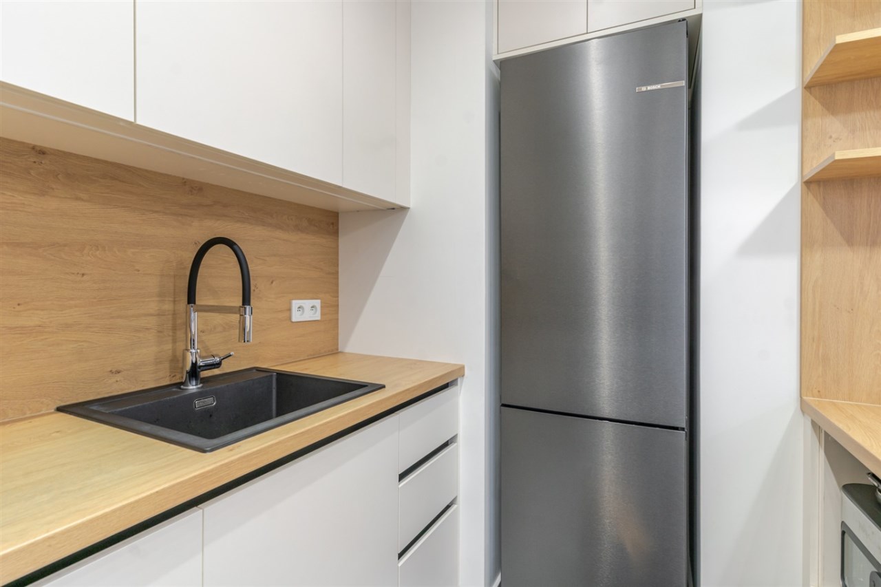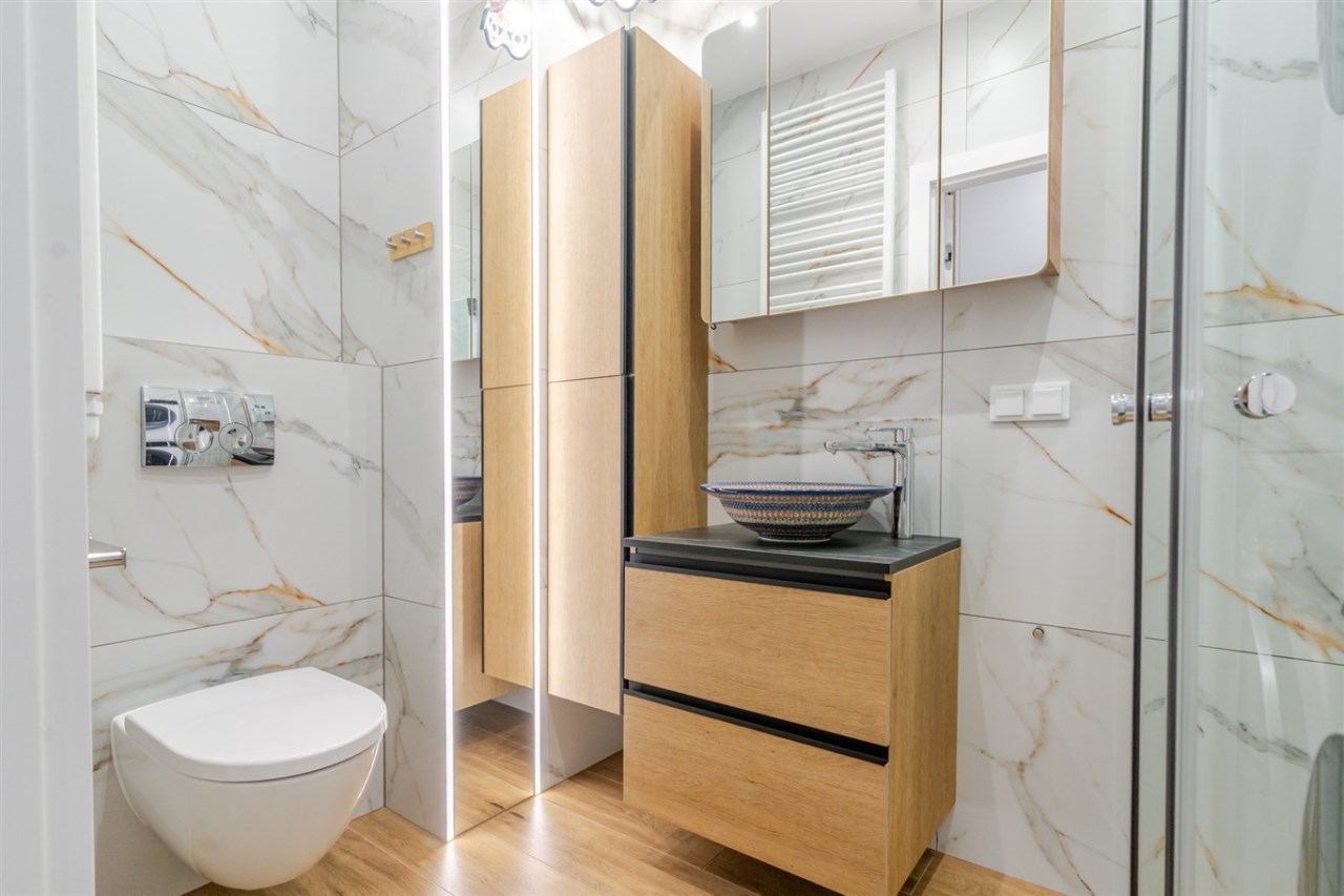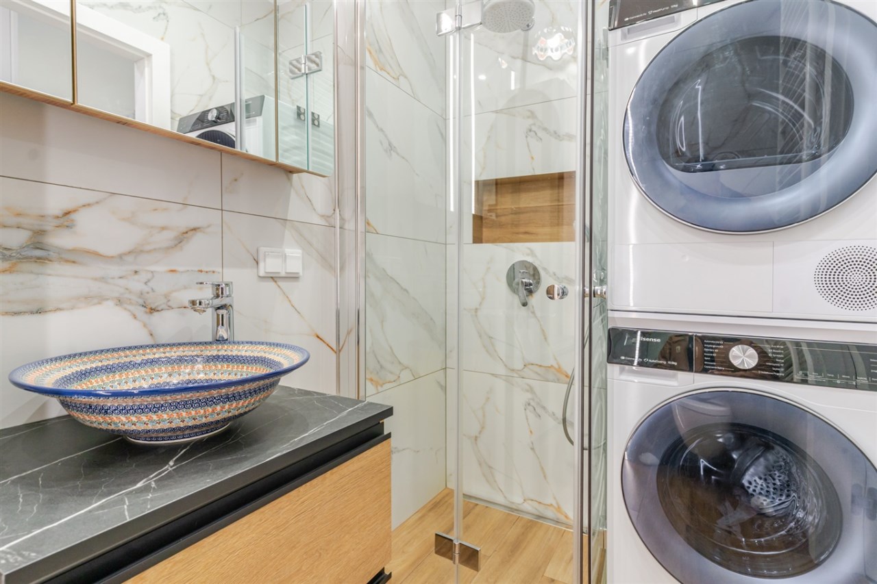 Mieszkanie zostało wykończone pod klucz. Posiada w pełni wyposażoną kuchnię w sprzęt AGD, w łazience znajduje się pralka oraz suszarka.